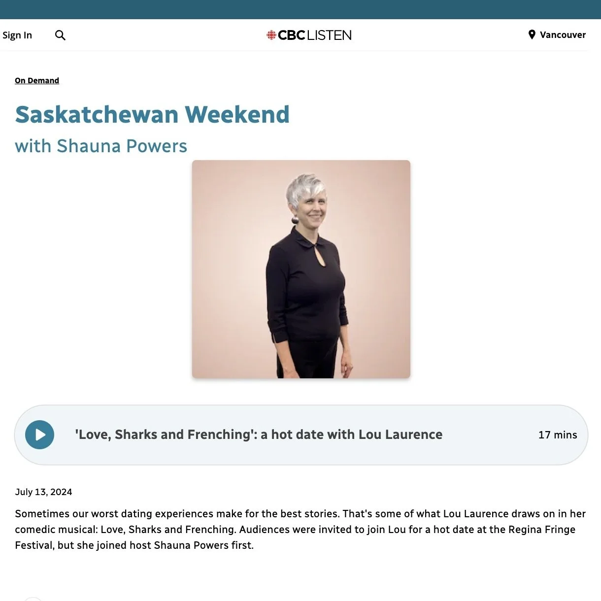 “Sometimes our worst dating experiences make for the best stories. That's some of what Lou Laurence draws on in her comedic musical: Love, Sharks and Frenching. Audiences were invited to join Lou for a hot date at the Regina Fringe Festival, but she joined host Shauna Powers first.”
